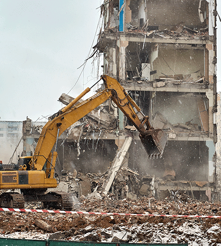 鉄骨造・鉄筋コンクリートの解体には、専門の重機や安全に作業をするための知識が必要です。鉄筋コンクリート解体では着工前に特定建設作業届けをし、大量に出る粉塵や壁倒し時の倒壊に注意しながら作業を進めていきます。